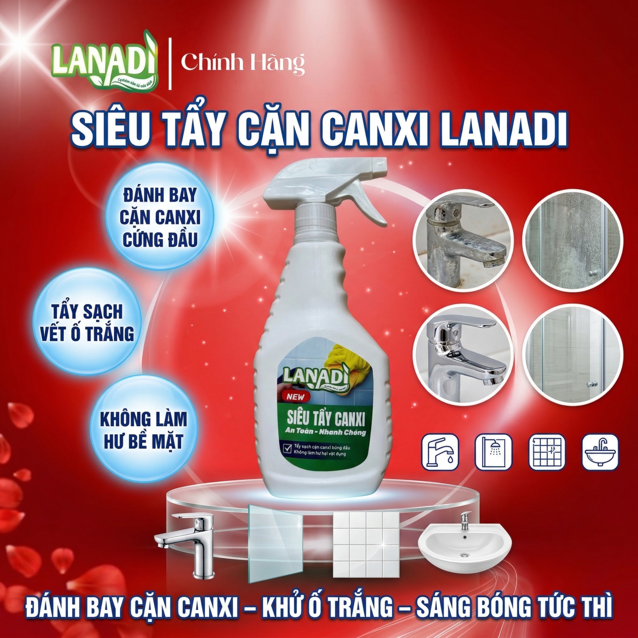1️⃣ Xịt trực tiếp Siêu Tẩy Cặn Canxi LANADI lên khu vực có cặn.